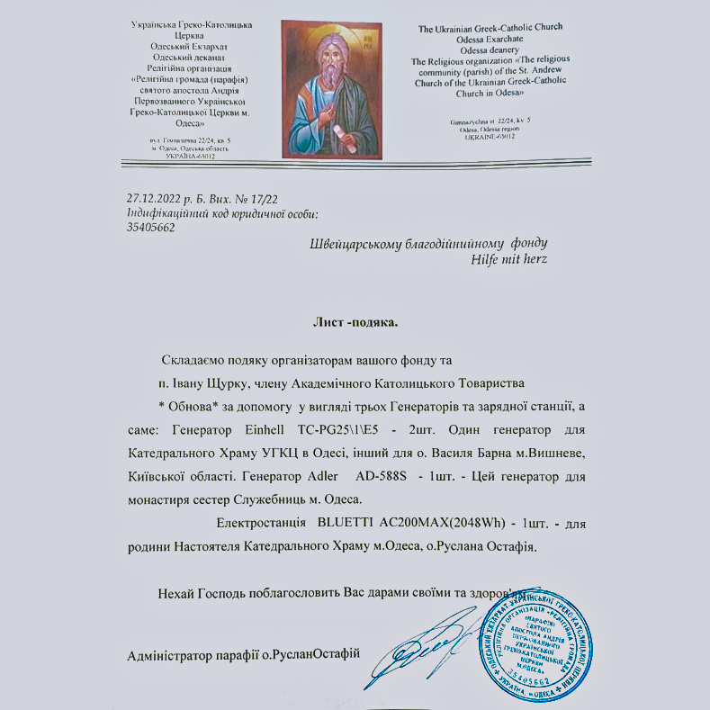 Da die Stromversorgung nicht mehr in allen Landesteilen sichergestellt werden kann, haben wir total sieben benzinbetriebene Stromgeneratoren mit einer Gesamtleistung von ca. 20’000 Watt in die Ukraine geliefert. Zum Einsatz kommen sie in Spitälern, Lazaretten und inländischen Flüchtlingszentren. Der Transport erfolgte über unsere guten Kollegen von ukrainehilfemitherz.ch.