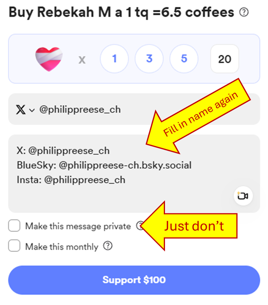 Option 1: Donations to Beka’s BuyMeACoffee at www,buymeacoffee.com/bekamaciorowski. Please leave your platform & @name in the comment section also. BuyMeACoffee sometimes overwrites the @name in the top field, this can be confusing. Philipp Reese from Switzerland will send you a DM on Twitter, Insta or BlueSky if you qualify for a patch. Be sure your DMs are open (or follow him).